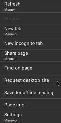 A Google sokkal egyszerűbbé teszi, és lehetőséget kínál az asztali nézet engedélyezésére az alapértelmezett Chrome böngészőben. Csak kattintson a jobb felső sarokban található beállítások menüre, majd jelölje be az „Asztali webhely kérése” lehetőséget.