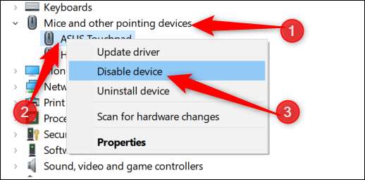 Az Eszközkezelőben bontsa ki az „Egerek és más mutatóeszközök” kategóriát, kattintson a jobb gombbal az érintőpad bejegyzésére, majd kattintson az „Eszköz letiltása” parancsra.