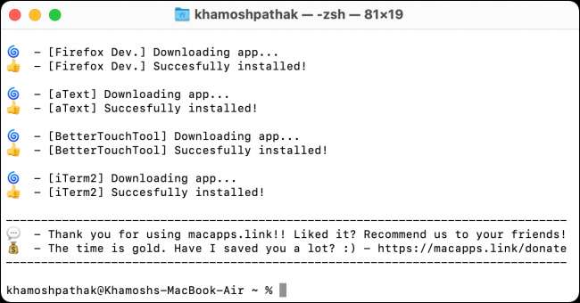 Attól függően, hogy hány apps kiválasztott, ez a folyamat eltarthat egy pár percig. Amikor a folyamat befejeződött, megjelenik a „Köszönjük, hogy a macapps.link” üzenetet a képernyő alján.