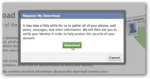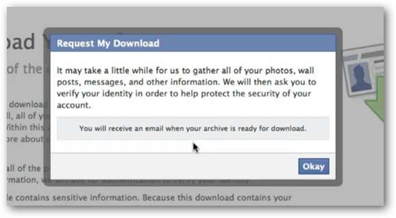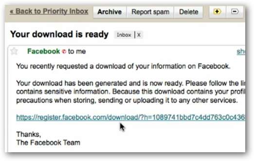 Időbe telik, mire a Facebook összeállít egy fájlt, amely tartalmazza az összes adatot, beleértve a Fotókat, az üzeneteket és egyéb információkat. Miután ezt megtették, kap egy e-mailt, amely azt mondja, hogy a letöltés készen áll, és egy linket, amelyre kattinthat.