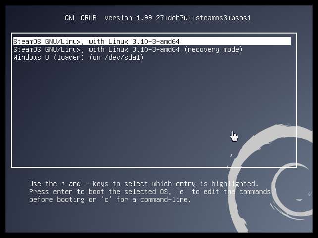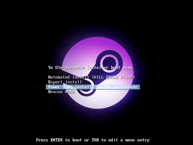 Amikor a lemezről indít, megjelenik a rendszerindítási menü. Ez a Valve SteamOS rendszerindító menüjének testreszabott változata. A Power User install (egyedi partíciók) opció itt a Ye Olde SteamOSe-ra vonatkozik, és lehetővé teszi a meglévő partíciók átméretezését és a kettős rendszerindító rendszer beállítását.
