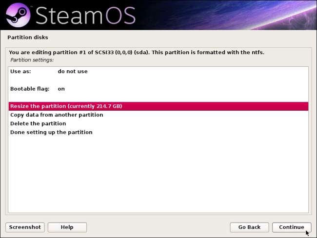 Válassza ki a Windows NTFS partíciót, és kattintson a Folytatás gombra annak átméretezéséhez, ami helyet biztosít a SteamOS számára.