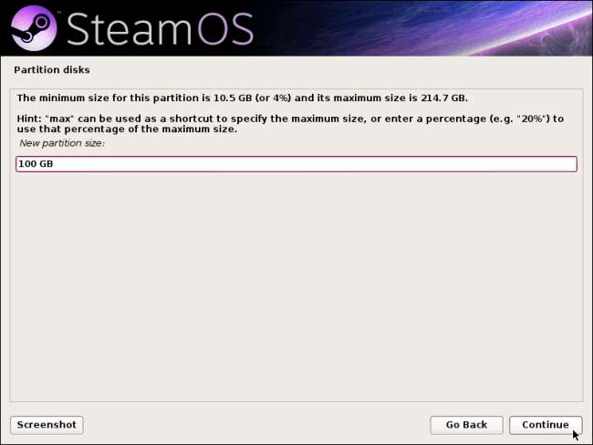 Először létrehozunk egy partíciót a SteamOS alaprendszerhez. Válassza az Új partíció létrehozása opciót, és adja meg a partíció méretét. A Valve ehhez 10 GB-os partíciót használ, de a directhex szerint abszolút minimum 3 GB-os partíciót használhat.