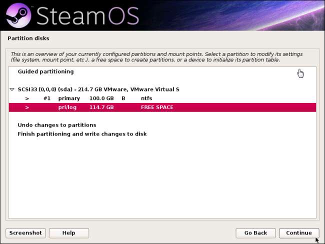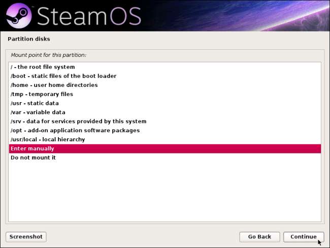 Válassza a Manuális lehetőséget, és kattintson a Folytatás gombra a lemez particionálásának megkezdéséhez. Ha a Guided - use full disk opciót választja, akkor a merevlemez törlődik, a SteamOS pedig a teljes lemezt használja.