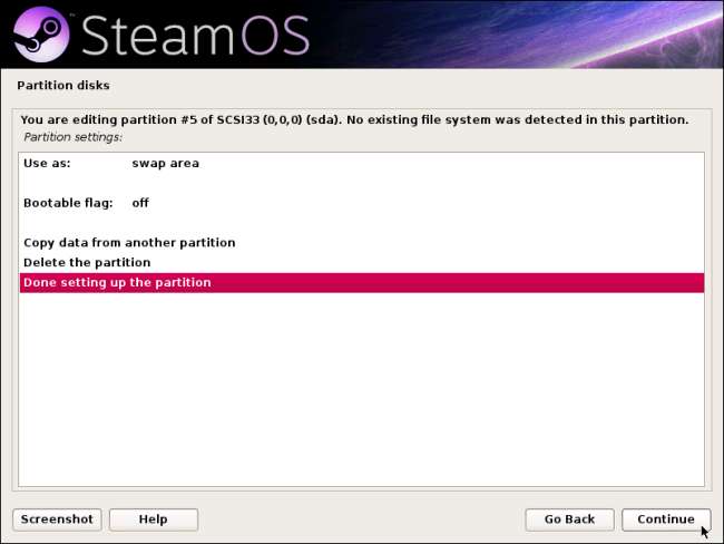 Válassza a Use as: opciót, és állítsa a Swap területre. Ha elkészült, válassza a Partíció beállítása kész lehetőséget, majd kattintson a Folytatás gombra.