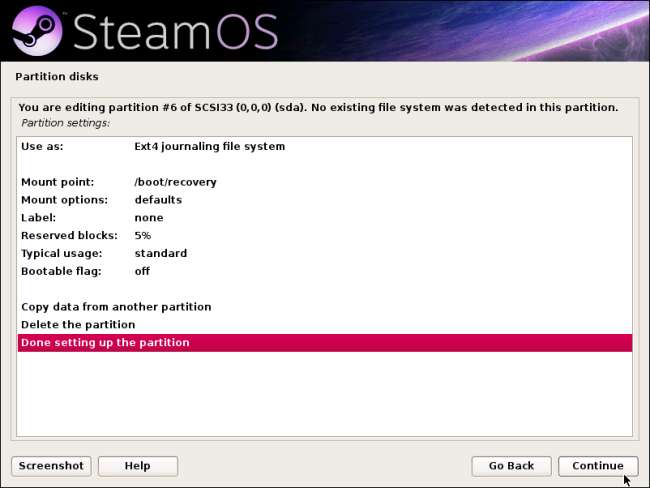 A SteamOS partícióinak most már hasonlítaniuk kell az alábbi képernyőképen láthatóakra. Válassza a Partíciózás befejezése lehetőséget, és írja be a változásokat a lemezre, ha végzett.