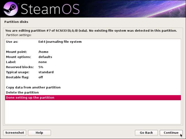 Állítsa a partíciót „Use as: Ext4” és „Mount point: / home” értékre. A telepítőnek automatikusan ki kell választania ezeket az opciókat. Ha végzett, folytassa.