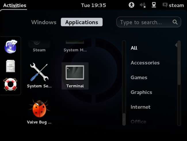 A SteamOS asztalon kattintson a Tevékenységek lehetőségre, válassza az Alkalmazások lehetőséget, és nyissa meg a Terminál ablakot.
