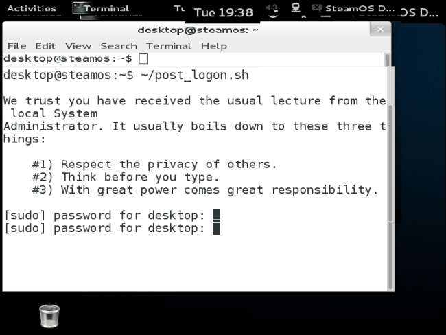 Amikor a rendszer kéri, írja be az „asztal” jelszót. A szkript felállítja a SteamOS-t, és automatikusan újraindítja a számítógépet a helyreállítási partíció segédprogramba, ezért hagyja csak futni.