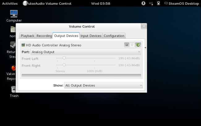 A SteamOS még nem nyújt jó hivatalos támogatást a különféle hangkártyákhoz. Futtatnia kell a PulseAudio Volume Control (pavucontrol) alkalmazást az asztal Tevékenységek menüjéből, és használni kell a hangkártya és a rendszer hangerejének kiválasztásához. A GNOME asztalra integrált hangerőszabályzó egyelőre nem fog működni a Ye Olde SteamOSe készülékkel.