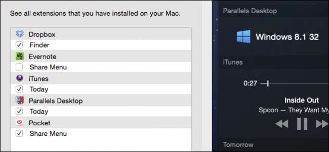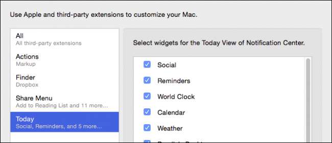 Végül vannak a „Today” kiterjesztések, amelyek olyan dolgokat tartalmaznak, mint a Social, az Emlékeztetők, a World Clock stb.