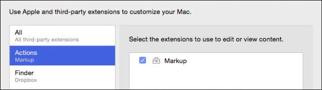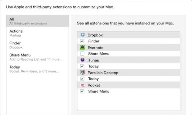Mint sejtette, a Bővítmények beállításai panel a Rendszerbeállítások menüből nyitható meg, vagy a Spotlight használatával . Amikor kinyitja őket, minden öt kategóriára oszlik: Mind (csak külső gyártók kiterjesztései), Műveletek, Kereső, Megosztás menü és Ma.