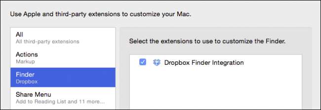 Egyes alkalmazások bővítményeket adnak a Finderhez, például itt a Dropbox segítségével.