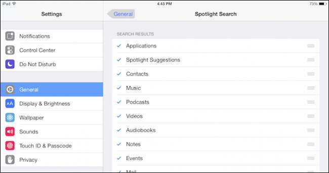 Nyissa meg a Beállításokat, érintse meg az „Általános”, majd a „Spotlight keresés” lehetőséget.