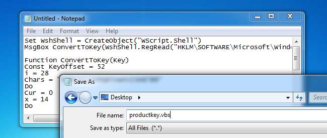 A Fájl -> Mentés másként menüpontot kell használnia, módosítsa a „Mentés típusként” beállítást „Minden fájl” elemre, majd nevezze el termékkódnak.vbs vagy valami hasonlónak, a vbs kiterjesztéssel végződve. Javasoljuk, hogy mentse az asztalra a könnyű hozzáférés érdekében.