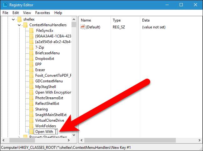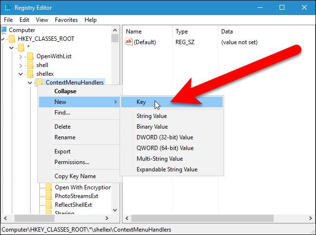 Ha nem látja a ContextMenuHandlers kulcs alatt az „Open With” nevű kulcsot, kattintson a jobb gombbal a ContextMenuHandlers kulcsra, és válassza a felbukkanó menü „Új”> „Kulcs” elemét.