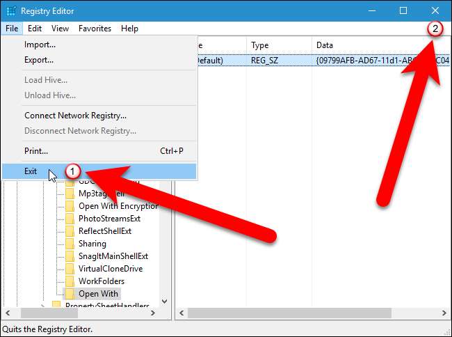 Zárja be a Rendszerleíróadatbázis-szerkesztőt, vagy a „Fájl” menü „Kilépés” elemével, vagy az ablak jobb felső sarkában található „X” gombra kattintva.