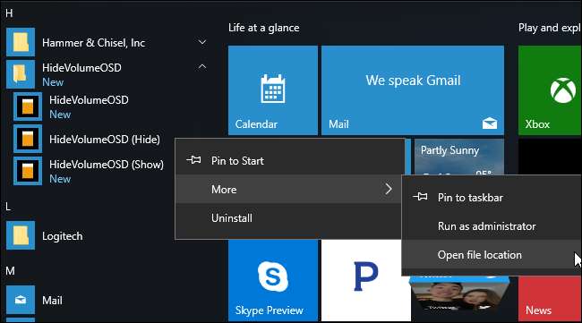 Ahhoz, hogy a program automatikusan fusson, amikor bejelentkezik, kattintson a jobb gombbal a Start menü „HideVolumeOSD” parancsikonjának egyikére, és válassza a Tovább> Fájl megnyitása lehetőséget.