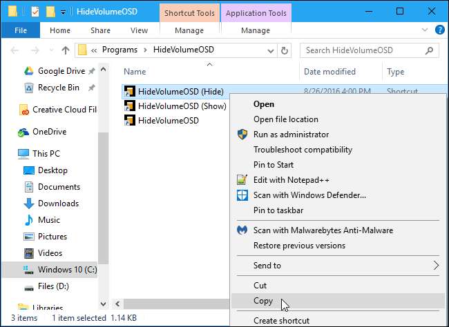 Kattintson a jobb gombbal a „HideVolumeOSD (Hide)” parancsikonra, és válassza a „Másolás” lehetőséget.