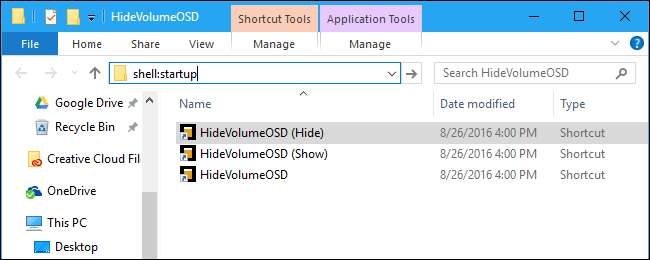 Futtathatja a „HideVolumeOS (Hide)” parancsikont, amikor el akarja rejteni a kötet OSD-jét. Még jobb, ha másolhatja a „HideVolumeOSD (Hide)” parancsikont a Startup mappába . A Windows akkor futtatja, amikor bejelentkezik a számítógépére, és minden alkalommal, amikor bejelentkezik, automatikusan elrejti a hangerő OSD-t anélkül, hogy futna a tálcán lévő ikon.