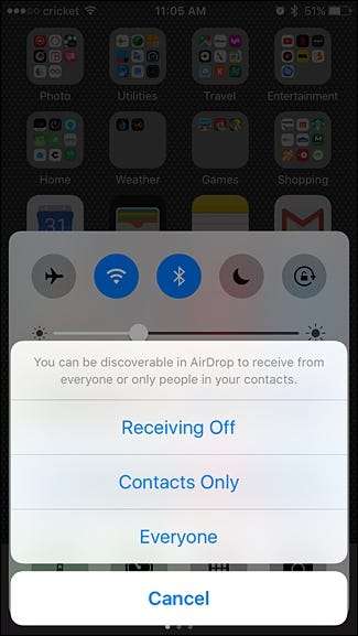 Ha fotókat szeretne átvinni iPhone-járól Mac-jére, egyszerűen csak az AirDrop segítségével „ossza meg” ezeket a képeket magával. IPhone-ján csúsztassa ujját felfelé a képernyő aljától a Vezérlőközpont megjelenítéséhez, majd érintse meg az „AirDrop” gombot.