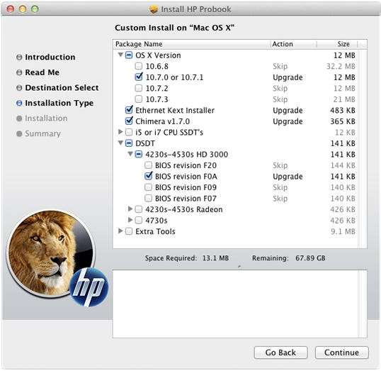 A következő lépés a legegyszerűbb. Töltse le a telepítőt és futtassa. Van néhány választás, amelyet meg kell tennie. Válassza ki a BIOS verzióját (valószínűleg korábban már megjegyezte, ezért utaljon erre). Ezután válassza ki, hogy mit kell telepíteni. Válassza ki az imént telepített OS X verziót (Snow Leopard esetén a telepítő futtatása előtt frissítsen 10.6.8-ra). Válassza ki az Ethernet Kext Installer, a Chimera (bootloader) és a megfelelő SSDT-t is, ha i5 vagy i7 CPU-t használ. Végül, a legfontosabb dolog, válassza ki a megfelelő DSDT-t. Először azonosítsa a ProBook melyik verzióját használja, legyen az beépített grafikus támogatással (HD3000), dedikált grafikával (Radeon) vagy a 4730S. Kattintson a név melletti nyílra az adott kategóriába tartozó elemek kibontásához. Ezután válassza ki a korábban feljegyzett BIOS-verziót. Nézze meg az Extra eszközöket is, és ellenőrizze, hogy telepíteni akarja-e valamelyiket. Az alábbi képernyőkép megmutatja, hogy milyenek voltak a választások a ProBook-on.