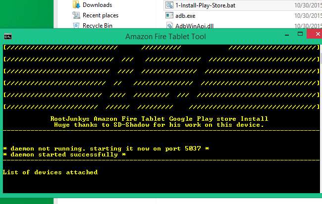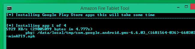A szkript telepíti a szükséges csomagokat a csatlakoztatott Fire táblagépre, beleértve a Google Play szolgáltatásokat és a Google Play Áruház alkalmazást.