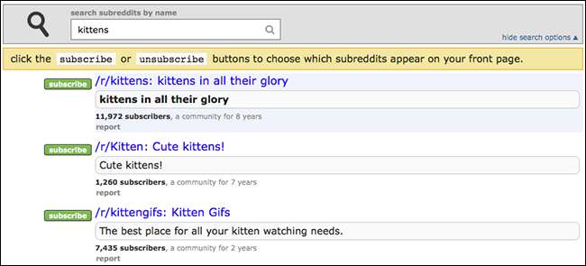 Először irány a Subreddit keresés magát a Reddit-et, és keressen néhány érdekes témát. Böngésszen a talált subreddits címlapjain; ha a jel-zaj arány jól néz ki, fontolja meg az előfizetését.