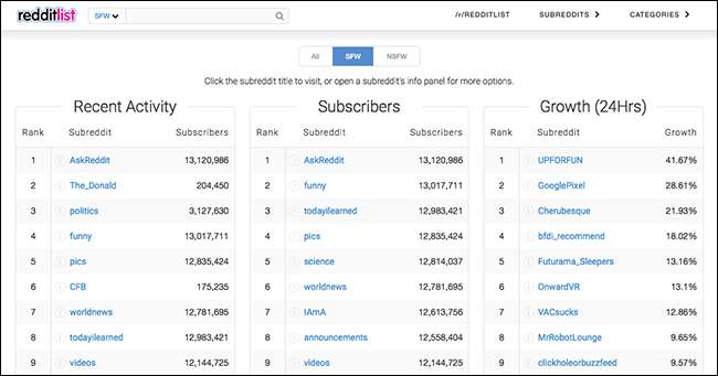 Ha képet szeretne kapni arról, hogy jelenleg mely közösségek gyarapodnak, menjen RedditList . Meglátja, hogy mely alprogramok jelenleg a legaktívabbak, amelyek hasznosak vagy nem. Kedveljük a harmadik oszlopot, amely a jelenleg gyorsan növekvő alprogramokat mutatja.