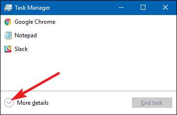 Ha először nyitja meg a Feladatkezelőt, az automatikusan kompakt módban nyílik meg - csak a futó programok felsorolásával. A Feladatkezelő további funkcióinak eléréséhez kattintson a „További részletek” melletti lefelé mutató nyíl gombra.