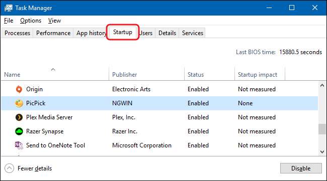 A Feladatkezelő ablakban váltson a „Startup” fülre. Ez a lap megjeleníti az összes olyan alkalmazást, amely a Windows rendszerrel indul, valamint részleteket, például az alkalmazás kiadóját, azt, hogy az alkalmazás jelenleg engedélyezett-e, és hogy az alkalmazás mekkora hatást gyakorol a Windows indítására. Ez az utolsó mutató csak annak mérése, hogy mennyi időbe telik az alkalmazás elindítása.