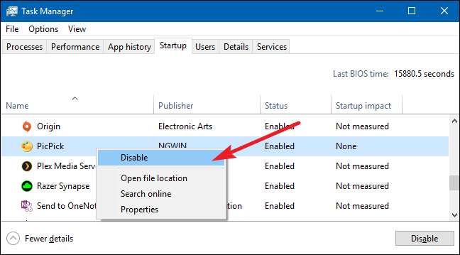 Ha biztos abban, hogy megakadályozza, hogy egy alkalmazás elinduljon a Windows rendszerrel, kattintson a jobb gombbal az alkalmazásra, és válassza a helyi menü „Letiltása” parancsát.