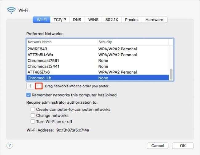 Ha a speciális panel nyitva van, ellenőrizze, hogy a Wi-Fi lapon van-e, és válassza ki azt a hálózatot, amelyre már nincs szüksége, majd kattintson a „-” gombra.
