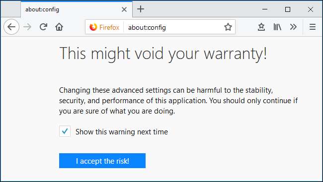 Ekkor megjelenik egy "Ez érvénytelenítheti a garanciát!" figyelmeztetés arra figyelmeztetve, hogy vigyázzon a beállítások itt történő módosításakor. Elronthatja a Firefox konfigurációját és problémákat okozhat, ha itt minden ok nélkül megváltoztatja a beállításokat. Csak kövesse az alábbi utasításokat, anélkül, hogy bármilyen más beállítást módosítana, és minden rendben lesz.