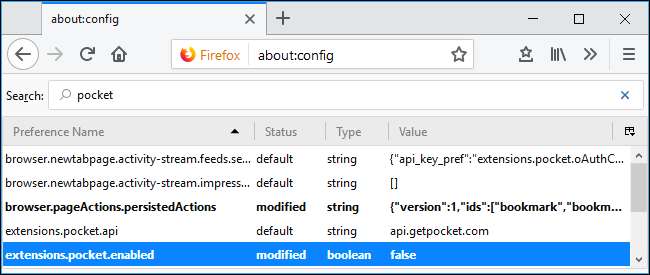 Kattintson duplán az „extensions.pocket.enabled” lehetőségre, hogy átváltsa a „False” értékre. A Zseb funkciói azonnal eltűnnek a Firefox címsorából és a Könyvtár nézetből.