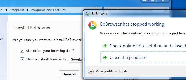 Most jelölje be mindkét négyzetet ... és megjelenik egy párbeszédpanel, amely azt mondja, hogy leállt. Kattintson a program bezárásához, és a BoBrowser nagy része eltávolításra kerül. De nem az összes.
