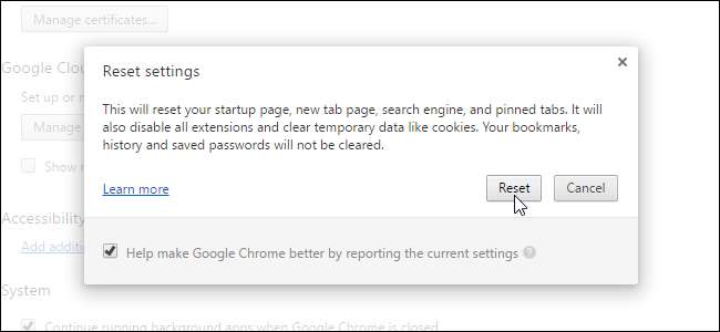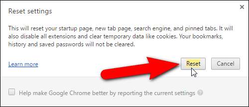 Megjelenik a Beállítások visszaállítása párbeszédpanel, amely megmondja, hogy mi lesz a beállítások visszaállítása. Kattintson a "Visszaállítás" gombra, ha biztosan vissza szeretné állítani a Chrome beállításait.