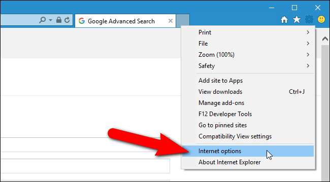 Ehhez nyissa meg az Internet Explorer asztali alkalmazást, kattintson a fogaskerék menüre a böngészőablak jobb felső sarkában, és válassza a legördülő menü „Internetbeállítások” elemét.