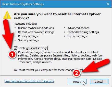 Az Internet Explorer letiltja a böngészőbővítményeket, és törli a böngésző, az adatvédelem, a biztonság és az előugró ablak beállításait. Ha vissza akarja állítani a kezdőlapot és a keresési szolgáltatókat, valamint törölni szeretné az ideiglenes fájlokat, az előzménybejegyzéseket és a cookie-kat, akkor jelölje be a „Személyes beállítások törlése” jelölőnégyzetet, hogy pipa legyen a mezőben. Ezután kattintson a „Reset” gombra.