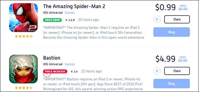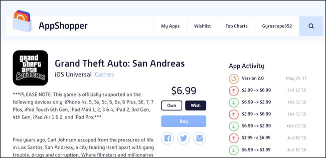 Az alkalmazás oldalán megtekintheti az App Store leírását, a legújabb frissítéseket, a képernyőképeket és egyebeket. A jobb oldalon láthatja a leghasznosabb információkat: az elmúlt néhány év minden árcsökkenését. Ez jó ötletet ad arról, hogy milyen alacsony az ár, amikor eladják, valamint bármilyen mintázatot (például, ha az alkalmazás rendszeresen eladódik az ünnepek alatt). Azt is elmondhatja, hogy egy alkalmazás soha nem kerül értékesítésre, ebben az esetben csak teljes áron vásárolhatja meg (vagy lemondhat róla, ha túl drágának érzi).