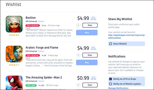 Néhány különböző eszköz használható, de szeretjük AppShopper . Ez lehetővé teszi a kívánt alkalmazások és játékok kívánságlistájának létrehozását, majd e-mailes értesítéseket küld Önnek, amikor az alkalmazások eladók. Ha szerencséje van, akkor még ingyen (vagy legalábbis 99 centért) is képes lehet némelyik ilyen fizetős alkalmazásokat befogni.