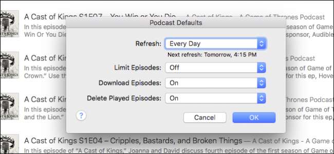 - Frissítés : a frissítési beállítással eldöntheti, hogy az iTunes milyen gyakran keres új podcast-epizódokat. A lehetőségek néhány óránként, minden nap és manuálisan is változhatnak. Ha helyet szeretne megtakarítani és maximális irányítást szeretne elérni, akkor valószínűleg a kézi beállítások a legjobbak.
