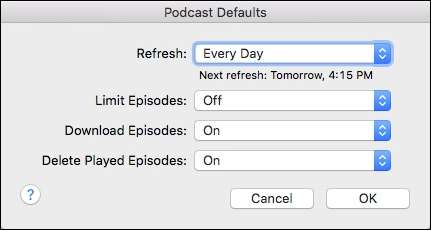 Miután megjelenik a Podcast alapértelmezettek párbeszédpanel, elkezdheti megváltoztatni a podcastok tárolási és letöltési módját.