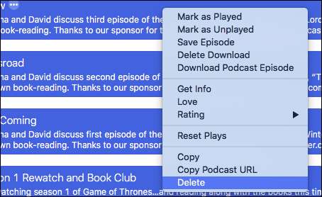 A podcastok tömeges törléséhez válassza ki az összeset a Command + A billentyűkombinációval, vagy tartsa lenyomva a „Command” gombot, és válasszon ki több epizódot. Ezután kattintson a jobb gombbal, és válassza a „Törlés” lehetőséget a megjelenő helyi menüből.