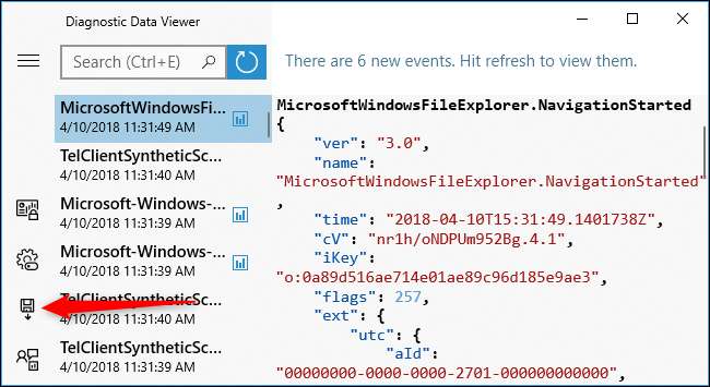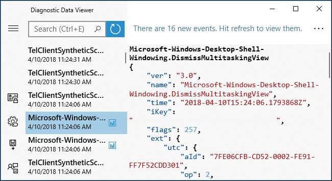 A Diagnostic Data Viewer alkalmazás nagyszámú diagnosztikai „eseményt” tár fel a bal oldali ablaktáblán. Az eseményre kattintva megtekintheti annak részleteit, amely tartalmazza a Microsoftnak elküldött összes információ teljes másolatát.
