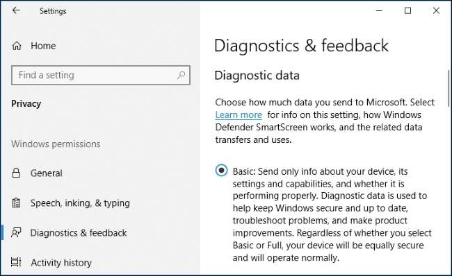 Alapértelmezés szerint a Windows 10 összegyűjti a „teljes” diagnosztikai adatokat és elküldi a Microsoftnak. Ha azt szeretné, hogy a Windows kevesebb diagnosztikai adatot gyűjtsön, lépjen a Beállítások> Adatvédelem> Diagnosztika és visszajelzések menüpontra, és válassza a „Diagnosztikai adatok” részben az „Alapvető” lehetőséget. Ezután a Windows elküldi a Microsoft által igényelt minimális diagnosztikai adatmennyiséget. Kipróbálhatja ezt, ha megnézi a Diagnostic Data Viewer alkalmazást, és meglátja, mennyivel kevesebb adatot küldenek a Microsoftnak.