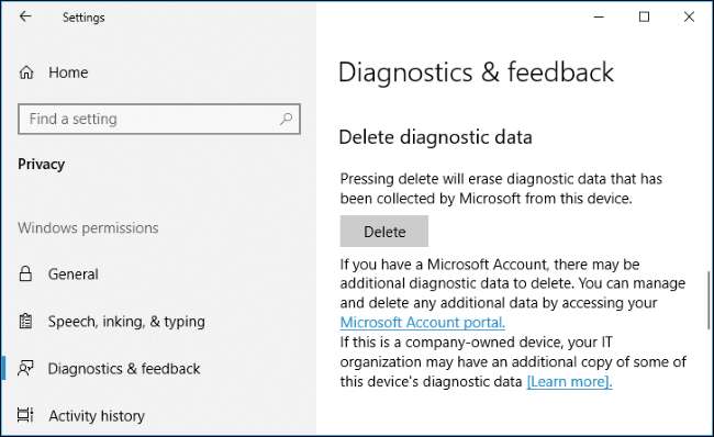 A Windows 10 lehetővé teszi a számítógépéről gyűjtött diagnosztikai adatok törlését a Microsoft szervereiről. Ehhez lépjen a Beállítások> Adatvédelem> Diagnosztika és visszajelzések menüpontra, görgessen le a „Diagnosztikai adatok törlése” szakaszig, majd kattintson a „Törlés” gombra.