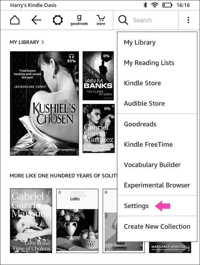 A Kindle-on válassza a Menü> Beállítások menüpontot.