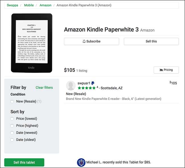 Sajnos, mivel a Kindles kezdetben elég olcsó, valószínűleg nem fog sok pénzt kapni egy régebbi, használt modellért. Egy vadonatúj Kindle Paperwhite 119,99 dollárért kiskereskedik az Amazon-on. Valaki 105 dollárért jegyzi a Swappa-t, de a legutóbbi akció 85 dollár volt. A használt, régebbi vagy olcsóbb Kindle-eket alacsonyabb áron fogják eladni.