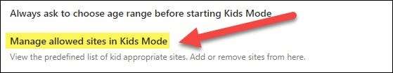 Ezután kattints a „Manage Engedélyezett webhelyek Gyerekek Mode” szabni a jóváhagyású weboldalainak.